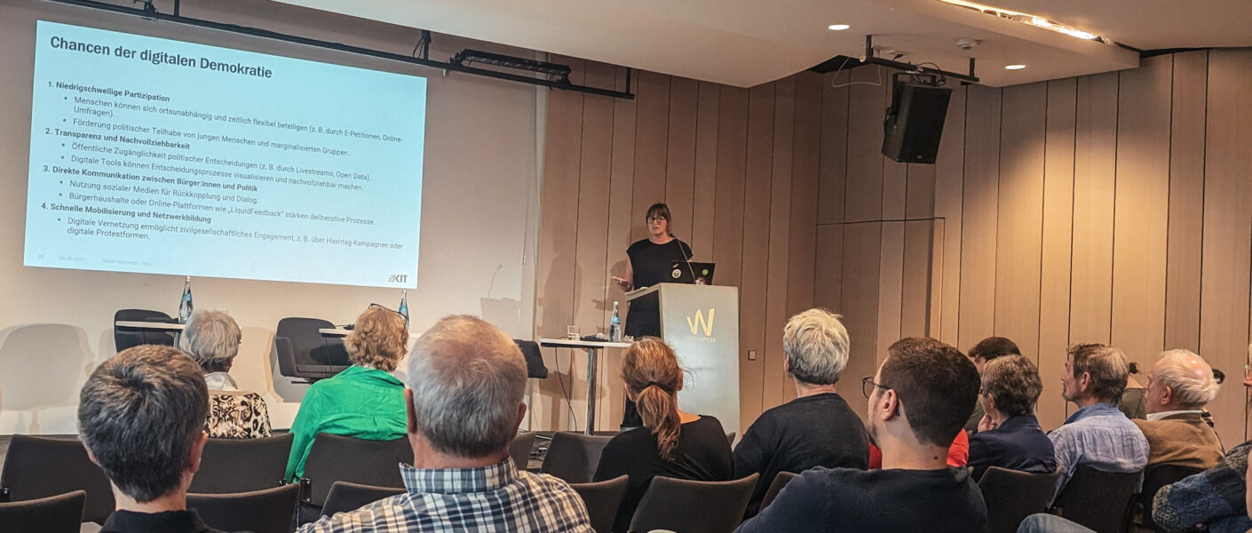 Im Anschluss daran gab es einen Impulsvortrag von Sarah Herrmann. Sie leitet das Projekt „Digitale Democracy – Schlüsselkompetenzen in und für digitale Demokratie“ im House of Competence am Karlsruher Institut für Technologie (KIT). Dabei geht es darum, wie digitale Tools dabei helfen können, Demokratie und politische Teilhabe zu verbessern und vor allem allem Studierenden Kompetenzen in diesem Bereich mitzugeben.