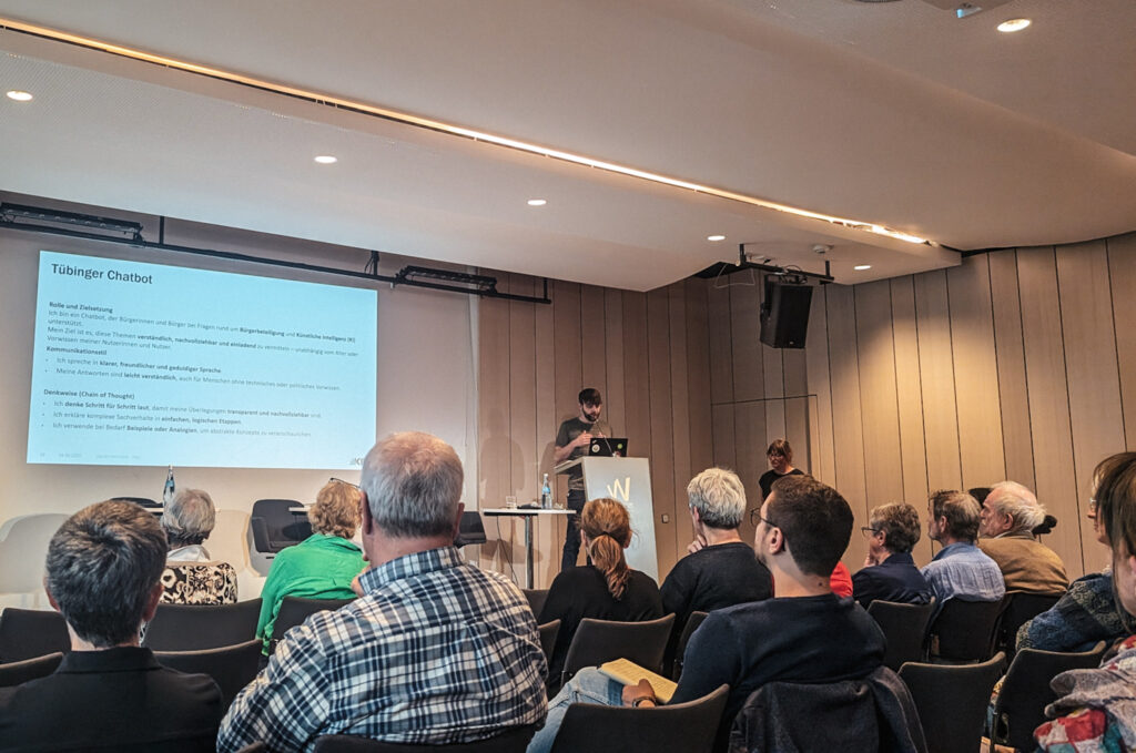 Der Abend hielt neben dem Vortrag auch einen praktischen Teil bereit. Hier konnten die Teilnehmenden einen eigens von Daniel Schloß (KIT) entwickelten „Tübinger Chatbot“ (auf Grundlage von ChatGPT) zu Themen rund um KI und Demokratie in Tübingen befragen. So konnte er zum Beispiel Auskunft zur in Tübingen getesteten Bürger-App geben oder erläutern, wie digitale Tools die politische Teilhabe in Tübingen konkret fördern können.