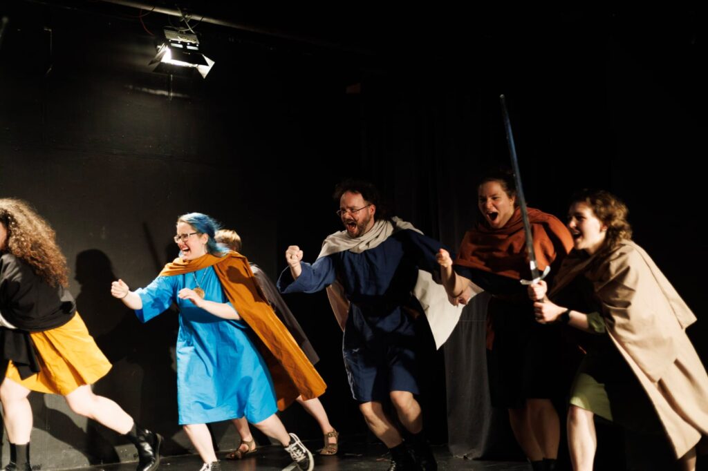 Dies machte sich auch in den Schwertkampfszenen bemerkbar, in denen die Choreographie der Schläge und Hiebe ausgeklügelt war und das Metall nur so klirrte. Und nicht nur die Technik saß, sondern auch die Sprache. Sätze, die schon fast an Zungenbrecher erinnerten, wurden genauso klar und präzise ausgesprochen wie lange Monologe und schnelle Dialoge.