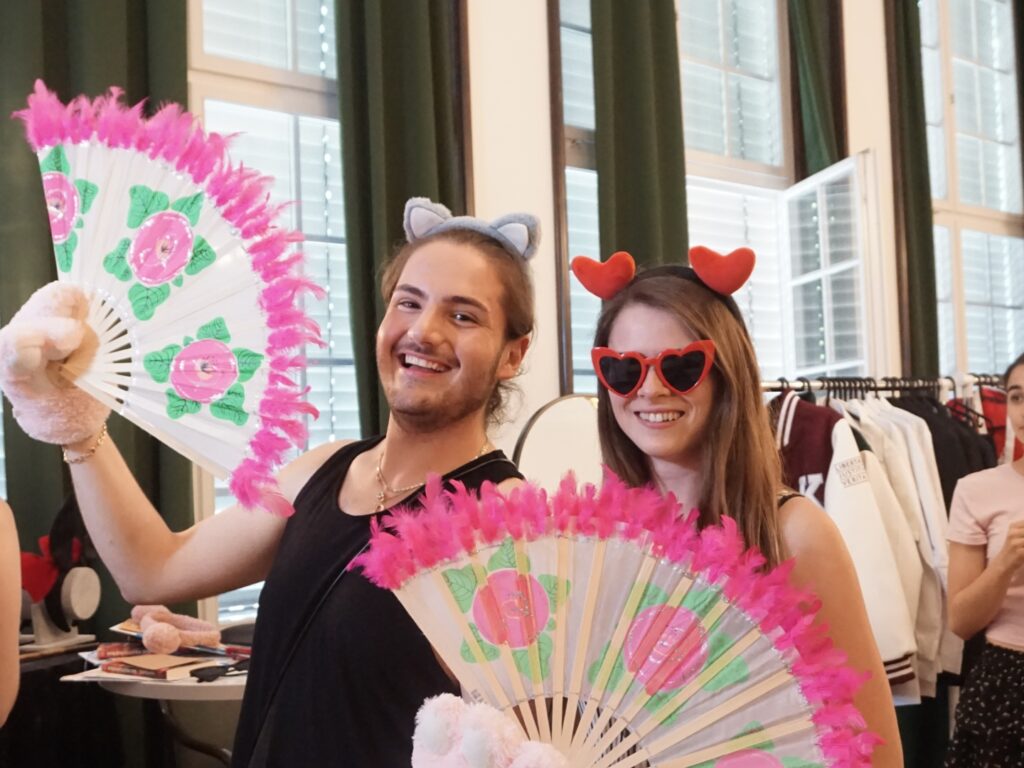 Simultaneously, various cultural experience booths were set up at the Kleiner Senat. One booth allowed visitors to try on a variety of outfits, including hanbok, Korean school uniforms, and university apparel. Another booth offered a photo shoot with props, such as traditional fans and headbands. Visitors could also make bookmarks inscribed with Korean phrases, providing a range of cultural experiences.