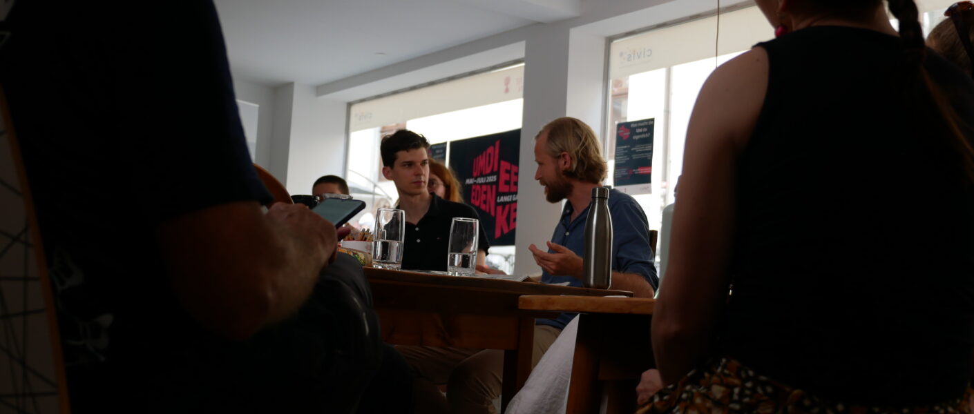 Gut gefüllt war es im Eckstein in der Innenstadt Tübingens. Dort versammelten sich trotz der Hitze einige Menschen, besonders junge Medieninteressierte, und saßen gemeinsam am großen Tisch, um sich mit der Zukunft der Presse und des Lokaljournalismus auseinanderzusetzen.