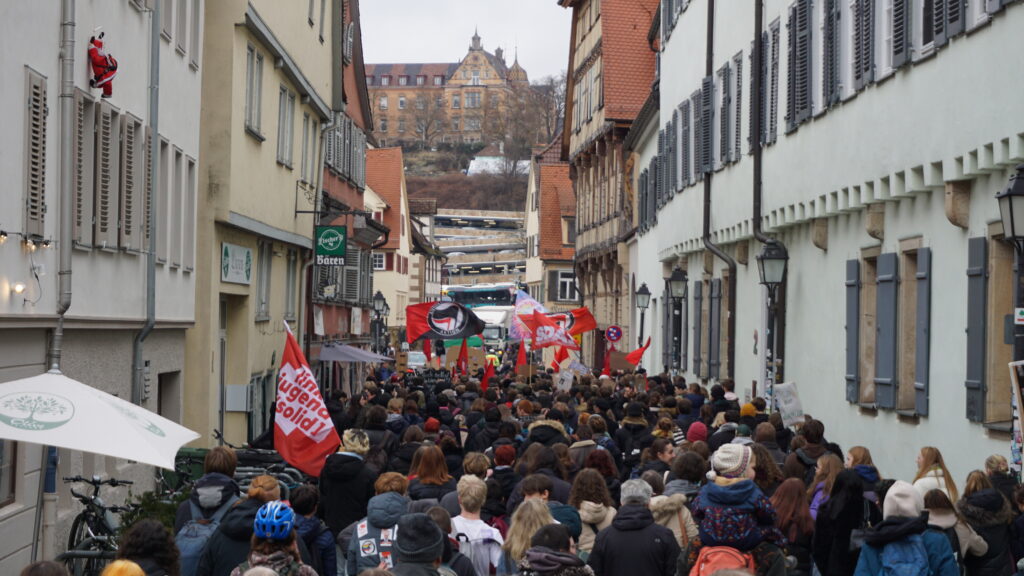 Der neue Wehrdienst kommt und die Tübinger Schülerschaft geht auf die Straße: Nachdem sich die Fraktionen der Union und SPD im November auf einen Gesetzentwurf für einen neuen Wehrdienst geeinigt hatten, stimmten am 5. Dezember 323 Abgeordnete des Deutschen Bundestages in namentlicher Abstimmung für die Modernisierung des Wehrdienstes ab. Keine zwei Stunden später lief ein Demozug von circa 400 Protestierenden durch die Tübinger Innenstadt. Ausgerüstet mit Megafonen und Demoschildern skandierten die Teilnehmer*innen lautstark ihren Widerstand gegen die Wehrpflicht.