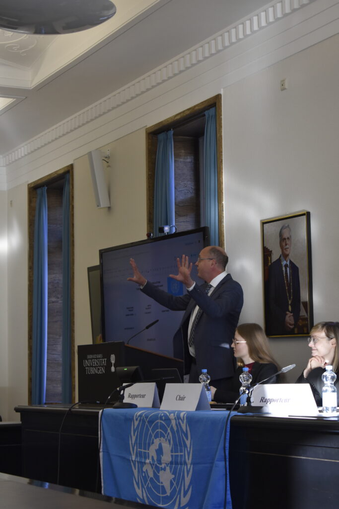Aus dieser Perspektive begründet er auch den Sinn des Formats: Die Vereinten Nationen prägten internationale Politik bis heute, umso mehr brauche es Menschen, die auf solche Arbeit vorbereitet sind. Die Tübingen Model United Nations sollen diese Vorbereitung leisten.
