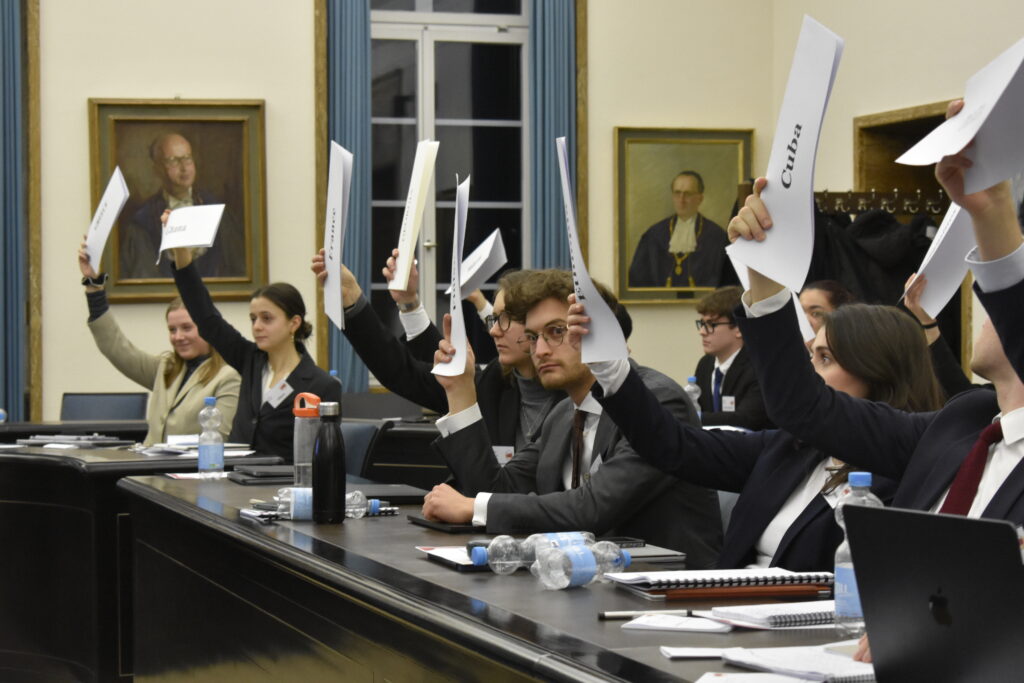 Bei der UN stimmen Delegierte ab, indem Sie das Placard (Namensschild) ihres Landes nach oben halten. Bild: NMUN Tübingen Delegation 2026