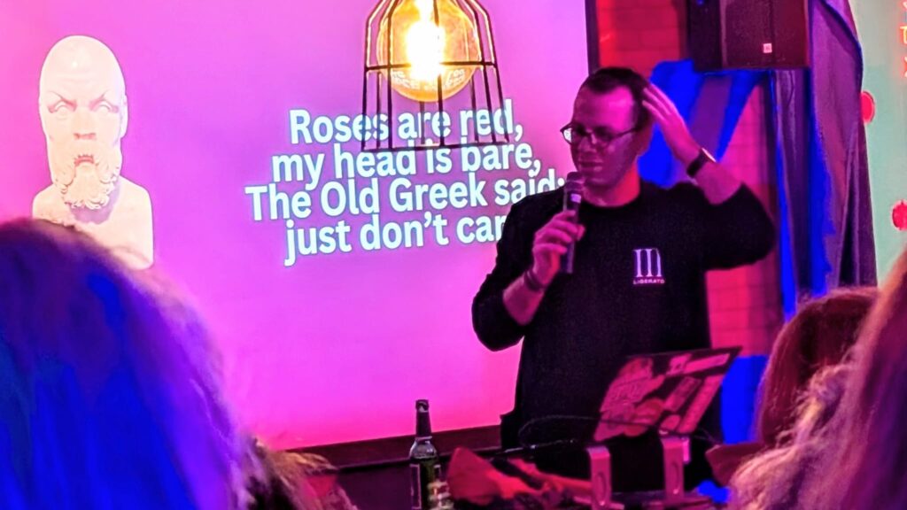 Aléxandros moderierte den Wettbewerb, der vom Campusmagazin Kupferblau gemeinsam mit Engage Tübingen ausgerichtet wurde. Zehn Studierende präsentierten auf humoristische und doch informative Art und Weise ihre akademische Laufbahn oder (aktuelle) Forschung. Zum Schluss ermittelte das Publikum per Applaus den oder die Gewinner*in.