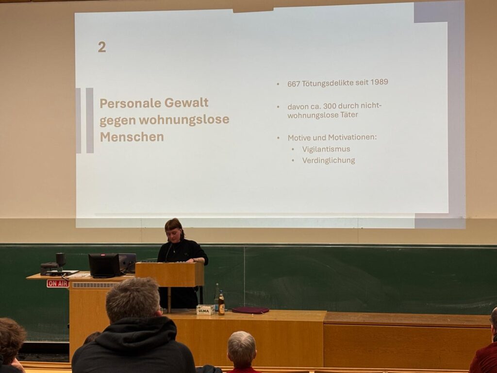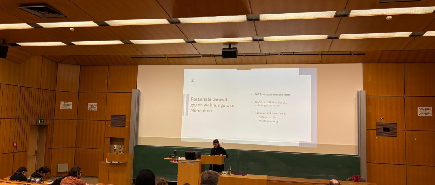 Im Rahmen der Aktionswoche zum Holocaust-Gedenktag organisierte der Arbeitskreis Politische Bildung der Verfassten Studierendenschaft 13 Vorträge und Workshops zu verschiedenen Themen rund um die Shoah, Erinnerungskultur und unterschiedliche Formen des Antisemitismus. Einen der letzten Vorträge hielt Merle Stöver. Sie promoviert aktuell an der Universität Bielefeld zu Tötungsdelikten an wohnungs- und obdachlosen Menschen zwischen 1989 und 2022, wobei ihr Schwerpunkt auf den Tatmotiven der Täter*innen liegt. In ihrem Vortrag zeigte sie die Kontinuitäten tödlicher Gewalt gegen wohnungslose Menschen auf.