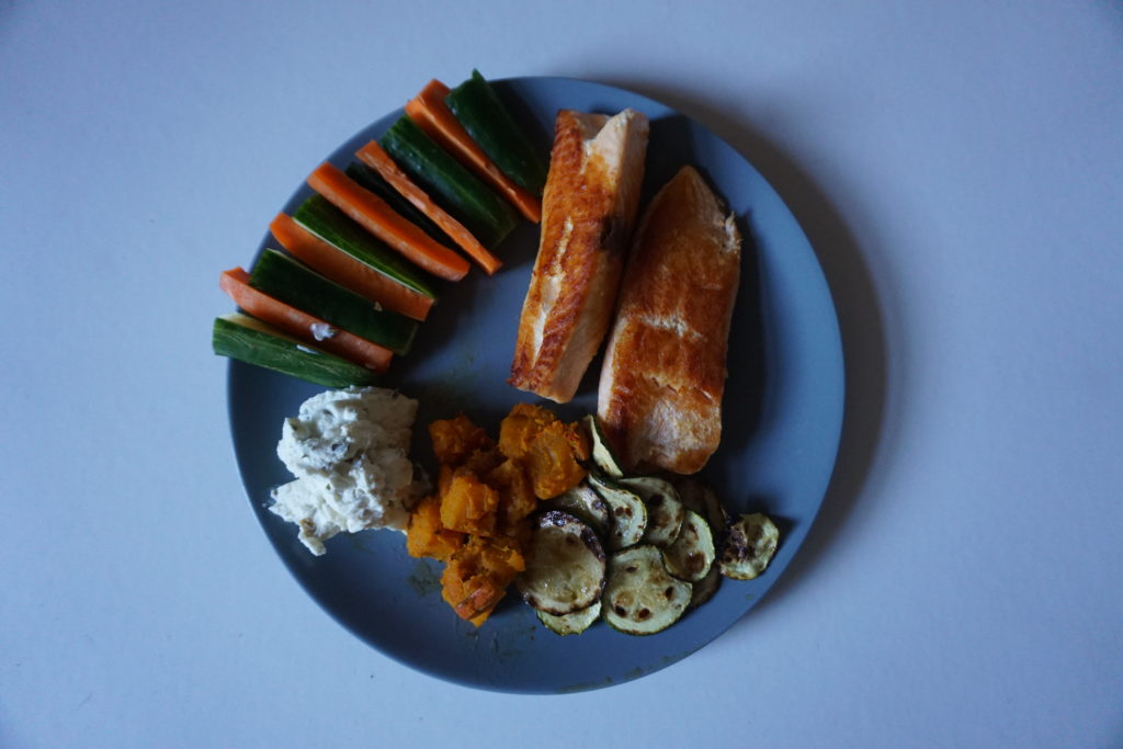 Am letzten Tag wollte ich noch gebührend Abschied nehmen, in der Hoffnung, so viel wie möglich von dieser Ernährungsform beibehalten zu können. Zu sehen ist gebratenes Lachsfilet, Kürbis-Karotten-Gemüse, gebratene Zucchini, Quark und Rohkost:
