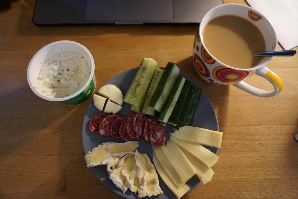 Die ersten drei Tage vergingen ohne Komplikationen; ich hatte frisch eingekauft, nur Online-Uni geplant und war noch voller Motivation. Mein erstes Frühstück bestand zum Beispiel aus einem Obstteller mit Birnenschnitzen, Banane, Erdbeeren, zwei getrockneten Pflaumen und einer kleinen Hand voll Nüssen. Dazu ein kleiner Becher Naturjoghurt. Bis dahin wäre mir noch nicht mal ein Verzicht aufgefallen. Auch mit Gemüsepfannen mit Thunfisch, oder Rohkost mit Kräuterquark ließen sich die ersten Tage wunderbar überstehen. Die kleine Sünde, die ich hier wohl anmerken sollte, ist mein Käsekonsum am Rande. Begonnen mit ein paar Scheibchen Parmesan nach dem Frühstück, über viel Reibekäse über der Gemüsepfanne, bis hin zu der Käseauswahl neben der Gemüseplatte. Ganz nach dem Motto „Käse schließt den Magen“. Mein Magen wurde in dieser Woche dauerhaft geschlossen.