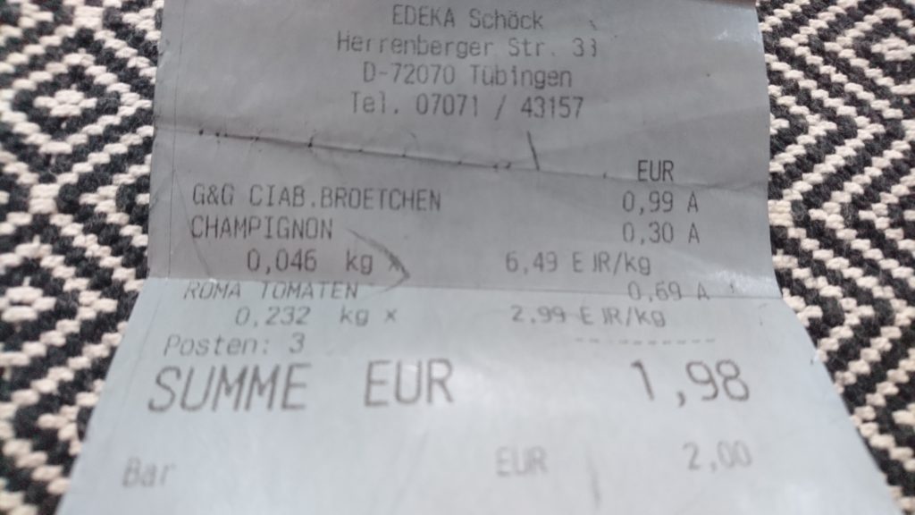 Ich muss einkaufen gehen. Sonst ein banaler Gedanke – für mich in dieser Woche jedoch eine echte Herausforderung. Wie schaffe ich es, mir ein relativ gutes Essen zu machen und dafür so wenig Geld wie möglich auszugeben? Okay, Nudeln und Pesto habe ich gerade noch so da. Für morgens brauche ich wieder etwas, da greife ich zu den günstigsten Aufbackbrötchen. Gesund ist anders, aber EGAL. Es geht schließlich darum, kaum Geld auszugeben. Damit meine Nudeln mit Pesto nicht gar so einsam und langweilig sind, beschließe ich, sie mit Champignons und Tomaten ein wenig aufzupeppen. Das gelingt mir mit insgesamt 1,98 Euro und ich spaziere mit einem selbstzufriedenen Grinsen unter meiner Maske aus dem Laden.