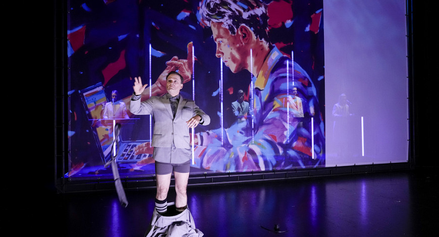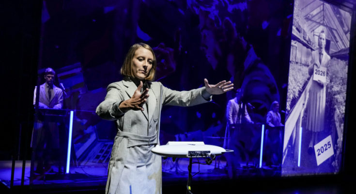 Der blaue Vorhang ist noch geschlossen, das Publikum im Theatersaal murmelt vor sich hin, da tritt eine uniformierte Person ins Scheinwerferlicht der Bühne und kündigt etwas Organisatorisches an – vermutlich routinemäßig wegen Corona. Doch das, wovon der Mann mit blonder Schmalzlocke im Anschluss erzählt, passt so gar nicht zur Art einer Routine: Die Rede ist von einer großen Revolution, wie es sie vorher noch nie gab. Die nächste Evolutionsstufe der Menschheit stehe unmittelbar bevor. Doch was ist damit gemeint?