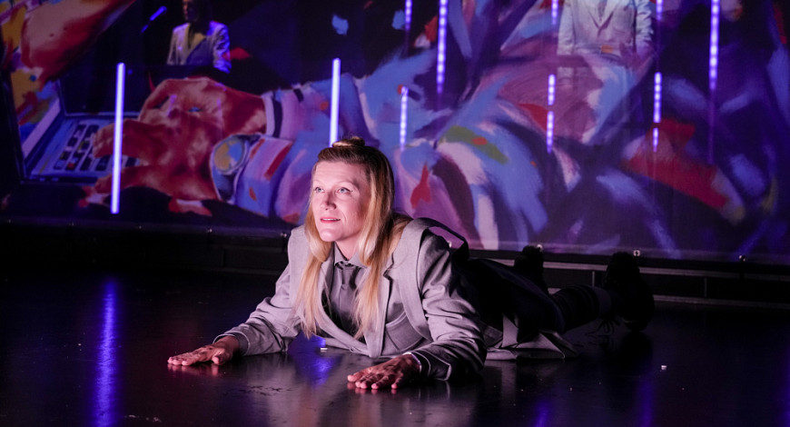 Doch besonders in der zweiten Hälfte der Aufführung wird klar – den Theatermachern Yael Ronen und Dimitrij Schaad geht es um mehr als bloße Science Fiction-Belustigung. Denn nicht die Handlungen der Charaktere machen die Theaterszenen so banal, sondern vor allem deren Ohnmacht. Sie entscheiden nicht mehr, sie wählen nicht mehr, sie wissen nicht (mehr), was sie wollen – um diese Angelegenheiten kümmert sich nämlich ab sofort ein Algorithmus für sie. „Alecto“, eine Art Weiterentwicklung der Sprachassistentin Alexa, weiß genau, was Doktor Stefan Frank zum Abendessen möchte; er weiß, welches Designerkind am besten zu Ricky und Lana passt. Er weiß sogar, wen die arbeitslose Amazon-Mitarbeiterin Tatjana in Wahrheit vermisst und warum sie aufgrund dieser Perspektivlosigkeit bald zur Terroristin werden wird.
