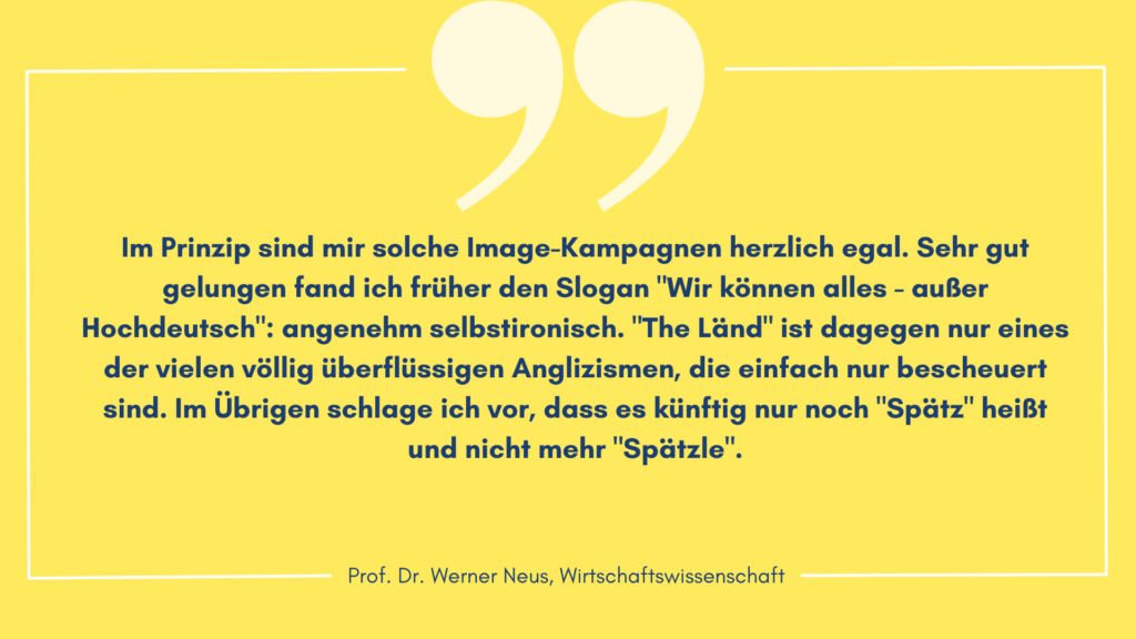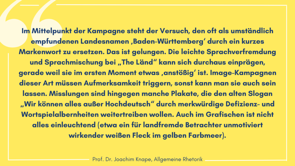 Baden-Württemberg. Mit schwarz-gelben Bildern verschafft sich das süddeutsche Bundesland ein neues Image – mit dem Motto „The Länd“. Das Land warb zuvor seit 1999 mit dem Spruch „Wir können alles. Außer Hochdeutsch.“ Jetzt spielt die Imagekampagne mit dem schwäbischen Wort „Ländle“ und dem Artikel „The“ in der neuen Sprache Schwänglisch.