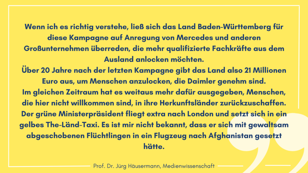 Doch nicht alle Menschen sind begeistert von der Werbekampagne. Im Netz erntet die Kampagne Kritik und teilweise Spott. Daher hat die Kupferblau 15 Dozent*innen aus Tübingen für eine Meinungsäußerung angefragt und drei Antworten bekommen, die eine eher zurückhaltende bis negative Einschätzung der Imagekampagne abbilden (s. gelbe Kästen).