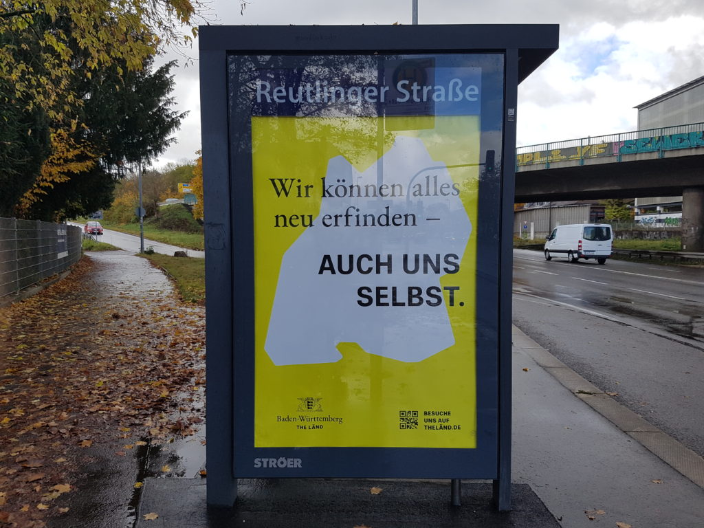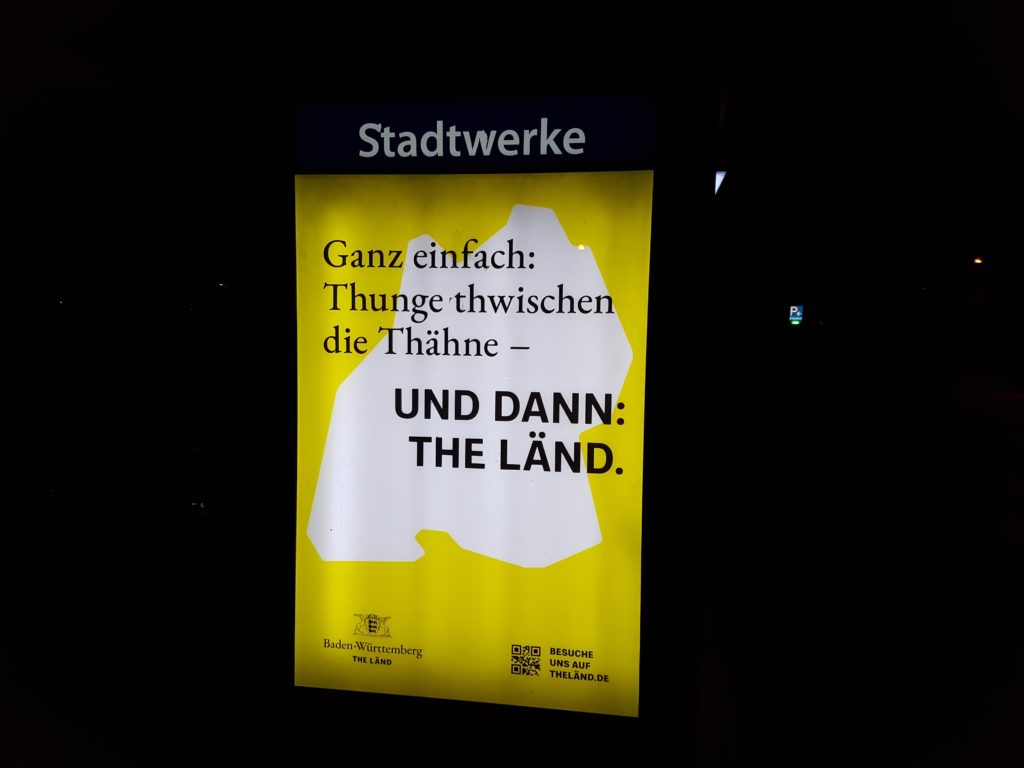 In Tübingen sah man ab Ende Oktober an einigen Bushaltestellen gelb-schwarze Werbeplakate mit verschiedensten Sprüchen. U.a.: Wir können alles neu erfinden – auch uns selbst oder Ganz einfach: Thunge thwischen die Thäne – und dann: The Länd. Auch auf Instagram oder auf der The-Länd-Homepage wird das Land mit Wortspielereien und Videos beworben.