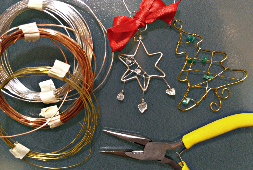 Alternativ zu der klebrigen Angelegenheit, kann im Bastelladen Draht gekauft und zu wunderschönen Dekorationselementen gebogen werden. Anbieten tut sich dafür Kupfer oder Messingdraht. Häufig gibt es den Kupferdraht auch versilbert. Ideal zum Biegen ist eine Flach- oder Rundzange. Und so geht’s: Das gewünschte Motiv kann zunächst zur Hilfestellung auf ein Stück Papier gezeichnet werden. Dann kann der Draht anhand des vorgezeichneten Motivs nachgebogen werden. Mit verschiedenen Drahtgrößen und Farben lässt sich toll herum spielen. Auch Perlen oder Steine können mit eingearbeitet werden. Vielleicht noch ein rotes Schleifchen für die extra Portion Kitsch: fertig!