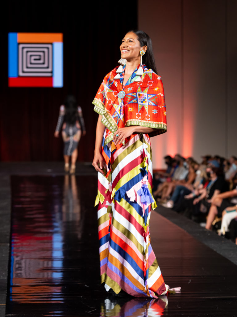 Eine Mischung aus Neumode und Tradition scheinen die Designstücke, die in der Ausstellung „Native Runway“ anhand von Fotografien gezeigt werden, zu verkörpern. Einige Oberteile oder Hosen wären tatsächlich auch auf der Straße tragbar, andere Kleider wirken durch bunte Farben und Stoffe bis zum Boden traditionell, wieder andere sind im typischen „Laufsteg-Stil“ gestaltet, mit extravaganten Kopfbedeckungen oder langen Bändern, die von den Schultern herabhängen.
