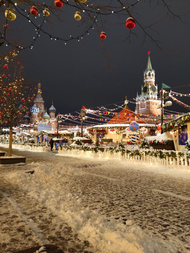 Der zweite mehr als überwältigende Anblick war der Красная Площадь (Krasnaja Ploschatz – Roter Platz). Ein paar Stationen mit der berühmt berüchtigten Moskauer Metro, ein langer Fußmarsch durch unterirdische Tunnel, ein paar Treppen hinauf und plötzlich steht man direkt neben dem Roten Platz. Gebäude ringsum rot, ein Weihnachtsmarkt mit Schlittschuhen und bunten Lichtern, die Basilius Kathedrale und das ГУМ (GUM) übersäht mit Lichterketten. Der Boden ist zu meinem Bedauern nicht rot geziegelt, die magische Stimmung durch Lämpchen, Musik und Schnee dennoch hergestellt.