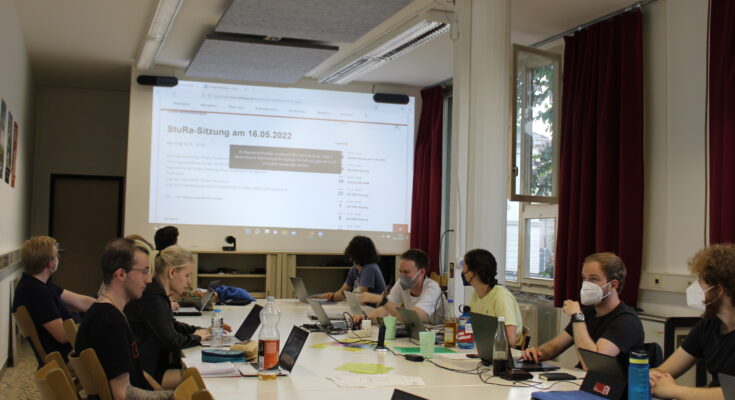 Es war die zweite StuRa-Sitzung in Präsenz, für viele Mitglieder sogar die erste StuRa-Sitzung in Präsenz überhaupt. Aus dem Nebenraum tönte wieder das Orchester, als der Geschäftsführende Ausschuss (Gabriel von der Linken Liste und Elena von der Liberalen Hochschulgruppe) die Sitzung eröffnete. Nachdem die Bestätigung der Ergebnisse des Umlaufverfahrens erfolgt war – u.a. werden Flinta-Schach und Impro-Theater gefördert werden – wurde der Termin für die nächste StuRa-Sitzung festgelegt. Wegen des Pfingstfeiertages in drei Wochen entschied man sich, sie in vier Wochen abzuhalten.