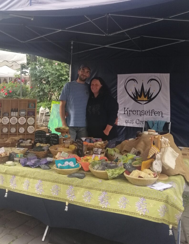 Robert Balke ist Quereinsteiger. Seine Kenntnisse aus dem Design-Studium sind nützlich, aber nicht nötig. „Im Grunde habe ich mir das alles selber beigebracht“, so Balke. Die meisten Biografien der Austeller*innen hier sehen wohl ähnlich aus. Auch Kathrin Marotta von der Seifenmanufaktur Kronseifen hat sich das Handwerk des Seife Siedens selber gelehrt und leitet heute ein kleines Familienunternehmen – bestehend aus ihr, ihrem Mann und einer Mitarbeiterin.