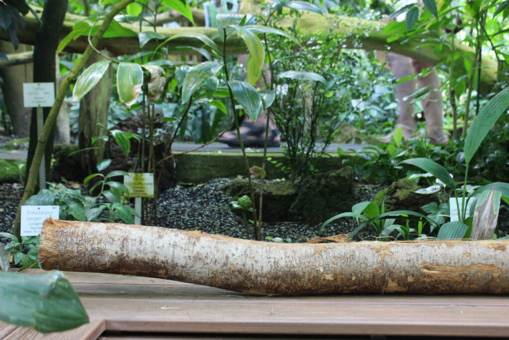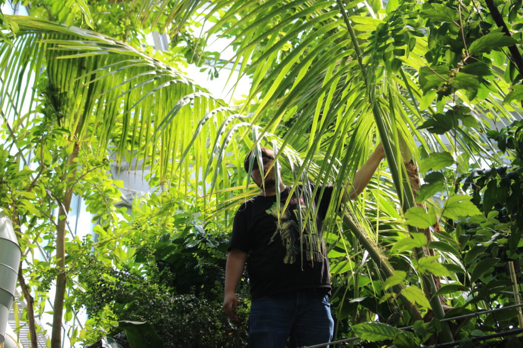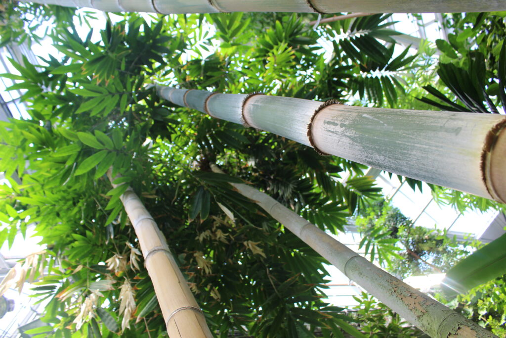 Im Tropicarium wächst zudem Riesenbambus, und zwar 20 bis 30 cm pro Tag. In der freien Wildbahn und bei idealem Klima wächst er sogar bis zu 70 cm pro Tag, und kann eine Höhe von 40 Metern erreichen. Da das Tropicarium nur zwölf Meter hoch ist, müssen die Gärtner*innen, derer achtzehn im Botanischen Garten festangestellt sind, ihn häufig schneiden. Die schnelle Wachsgeschwindigkeit ist für die Ernte natürlich sehr praktisch.