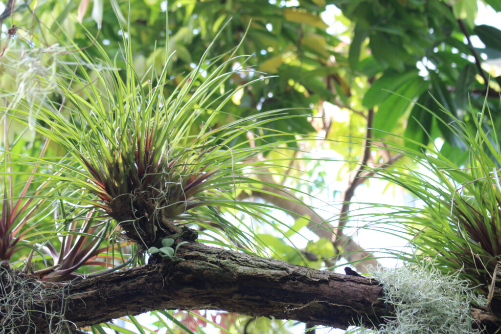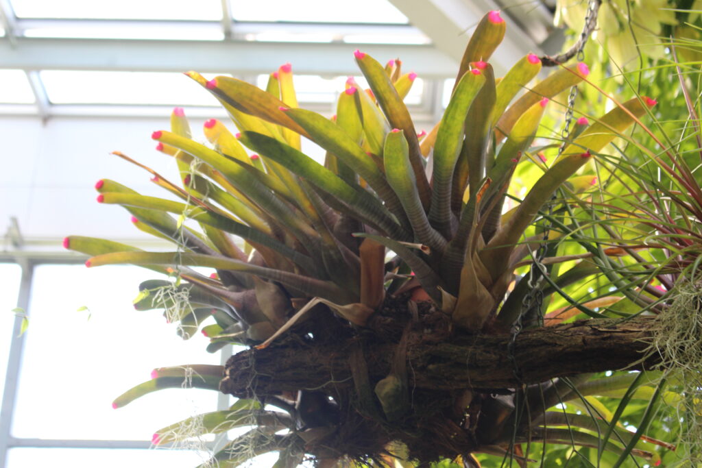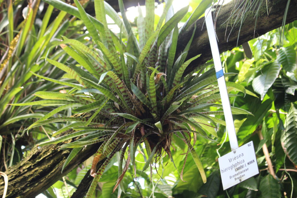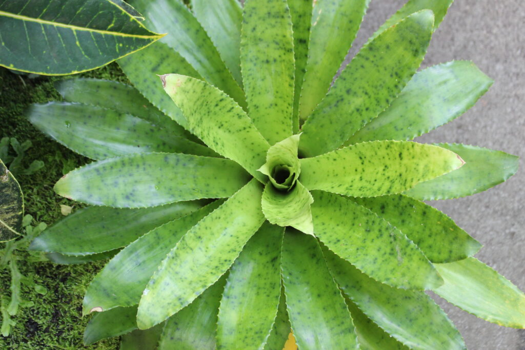 Die spiraligen Blätter der Bromelie sind ein beliebter Aufenthaltsort für Frösche. Auch im Tropicarium leben viele Frösche – einige nur daumengroß –, die dafür zuständig sind, Insekten zu fressen. Bei den Nachtführungen kann man sie ab und zu hören.