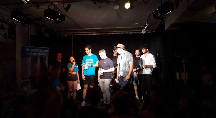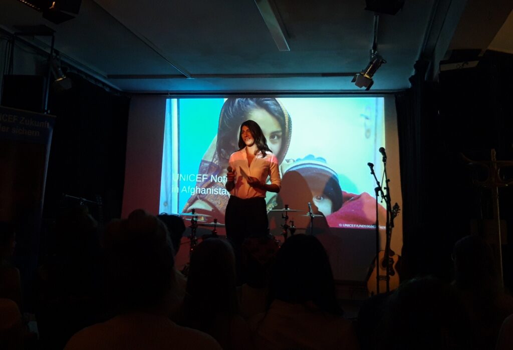 Danach geht es weiter mit dem Poetry Slam von Richard König, dessen Einleitung das Publikum ständig zum Lachen bringt. Vor der Pause präsentiert noch Naray aus der Hochschulgruppe die aktuelle Lage in Afghanistan und erzählt über ihre persönliche Familiengeschichte: Ihr Großvater hat sich in Afghanistan für Menschen engagiert, bis er schließlich wegen Gefahr flüchten musste. Nun arbeitet Naray in seinen Fußstapfen weiter.  Ihre Erzählung bringt das Publikum wieder zum Schweigen, die Tränen sind nicht weit weg.