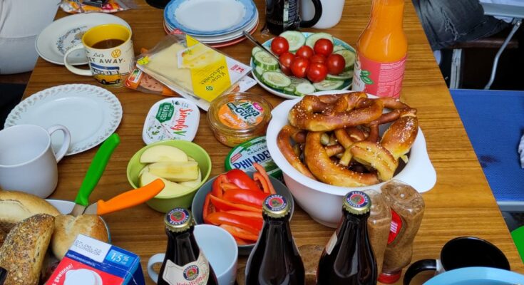 Frühstücken ist für mich etwas ganz Besonderes. Im Normalfall gibt es das bei mir nichts und wenn doch, dann richtig. So auch an besagtem Sonntag, an dem ich mein erstes Weißwurstfrühstück genoss. Da ich eingeladen war, hatte ich sogar den Luxus mich an einen fertig gedeckten Tisch setzen zu dürfen. Es fehlte an nichts. Rohkost, Obst, Brötchen, Aufstriche, Säfte und selbstverständlich Brezeln, süßer Senf, Weißwürste und Weißbier türmten sich.