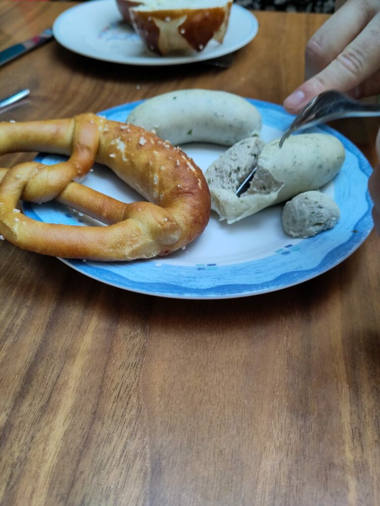 Der Startschuss wurde durch das Anstoßen gesetzt. Als alle Teller gehäuft waren, begann mein Unwissen deutlich zu werden. Ich wollte die Weißwürste einfach in Scheiben schneiden und wurde schnell unterbrochen. Zuerst die Haut entfernen. Aber wie?