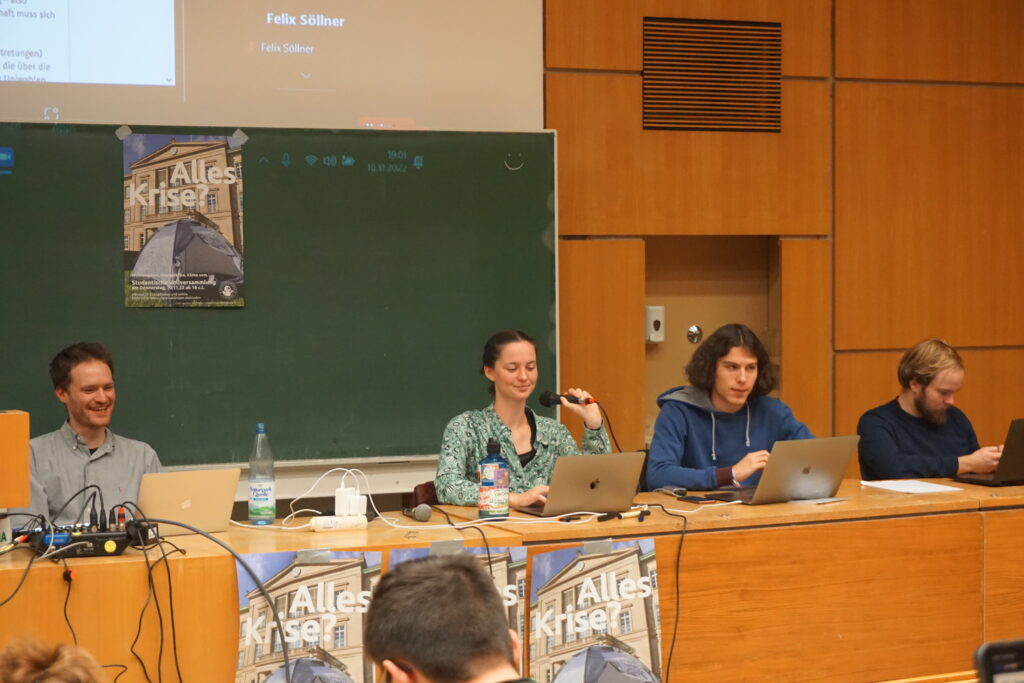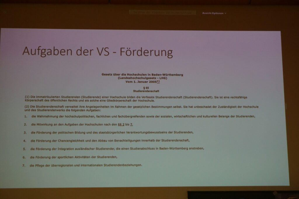 Diese stellten zunächst die Projekte vor, die die Verfasste Studierendenschaft im letzten Semester geplant oder realisiert hatte. Dazu gehören unter anderem finanzielle und/oder organisatorische Unterstützung bei der Durchführung des Ract!-Festivals, des Emotionsfestivals, einer Demonstration in Solidarität mit dem Iran oder einer Vortragsreihe von Fridays for Future. Des Weiteren hat die Verfasste Studierendenschaft im vergangenen Semester einen Antrag auf die Umbenennung der Universität im Senat eingereicht. Der Antrag wurde zwar abgelehnt, hat jedoch zu vermehrt kritischer Auseinandersetzung mit der Vergangenheit der Uni geführt. Zudem gab es einen sehr positiven Bericht zum frisch eingeführten Notlagenstipendium, welches Studierenden mit finanziellen Problemen für bis zu drei Monate Unterstützung bietet. Auch an der Wahl der neuen Rektorin im Senat war die Verfasste Studierendenschaft beteiligt und hatte sich zudem vorher mit allen Kandidatinnen getroffen. In einem letzten Punkt wurde nun das neuste Vorhaben der Verfassten Studierendenschaft vorgestellt, nämlich die Übernahme der Cafeterien im Clubhaus und an der Morgenstelle. Diese möchte das Studierendenwerk aufgeben, sobald die Mensa in der Wilhelmstraße fertiggestellt ist. Die Verfasste Studierndenschaft möchste sie übernehmen, damit Studierende sich weiterhin zu fairen Preisen Essen und Getränke holen können, und damit der Lernraum in beiden Cafeterien erhalten bleibt.