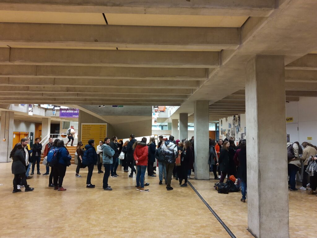 Es scheint auf den ersten Blick wie ein gewöhnlicher Donnerstagabend im Brechtbau: Rauchende Studis unterhalten sich vor dem Eingang, aus der Cafeteria dringt verhaltenes Gelächter, die Liegewiese vor der Bibliothek leert sich allmählich. Allerdings scheint heute jedoch etwas anders zu sein: im Foyer, das zu dieser Zeit normalerweise eher verlassen wirkt, herrscht reger Andrang! Vor dem Brechtbau-Theater hat sich eine lange Schlange gebildet. Aufgeregt strömen die Menschen in den Publikumsraum, um sich dort dicht gedrängt einen Platz vor der Bühne zu sichern.