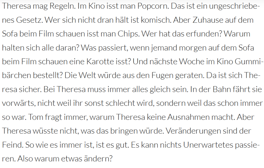 Also beim kreativen Schreiben kriege ich das ganz gut hin, kurze Sätze zu schreiben. Wenn es um die Uni geht, kann ich das glaube ich nicht so gut. Da wird es dann immer sehr lang und kompliziert. Was meinen Mitarbeitern aufgefallen ist, ist, dass ich manchmal in einen saloppen Sprachgebrauch übergehe. Das habe ich aber meistens wieder rausgenommen. Wenn man zum Beispiel Dialekt mit reinbringt ist das so spezifisch, dass es nicht gut bei der breiten Masse ankommt. Ich habe das meistens wieder rausgenommen und es ersetzt durch einfache Sätze und ‚richtiges‘ Hochdeutsch (lacht).