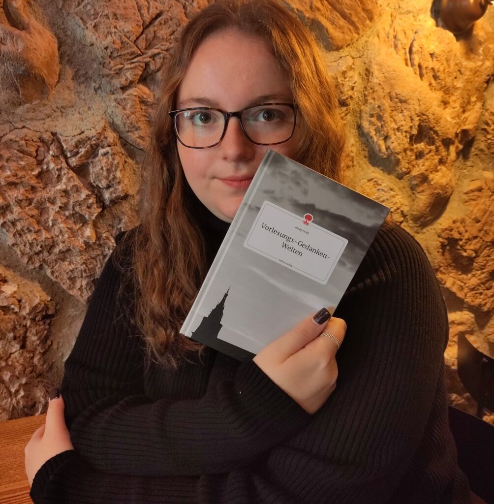 Holly Geiß (25 Jahre) ist Studentin an der Universität Tübingen (Internationale Literatur & Slavistik). Dieses Jahr hat sie ein Buch mit dem Titel ‚Vorlesungs-Gedanken-Welten‘ veröffentlicht. Es besteht aus 17 Kurzgeschichten über alle möglichen Alltagssituationen, die sich – mal mehr mal weniger – ins Absurde entwickeln. Bunt zusammengewürfelt und allesamt entstanden während der Vorlesungszeit, lesen sich die meist dreiseitigen Geschichten auch gut in einer 5 Minuten Pause oder auf dem Weg zur Uni. Über absurde Geschichten, Gehirngespinste und die Liebe zum Lesen erzählt uns Holly im Interview.