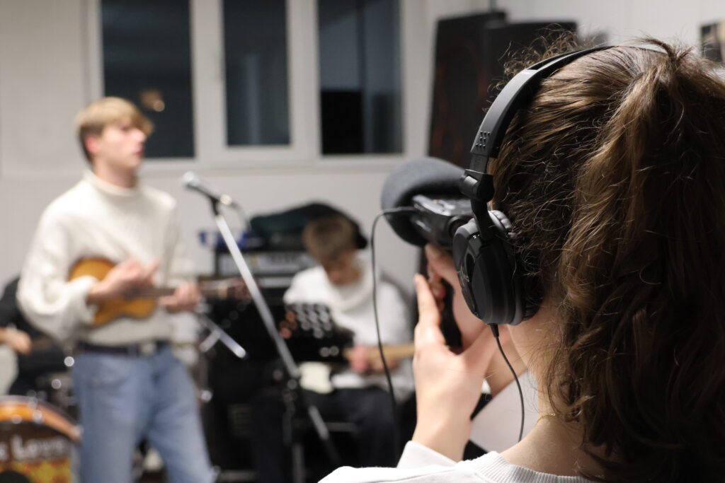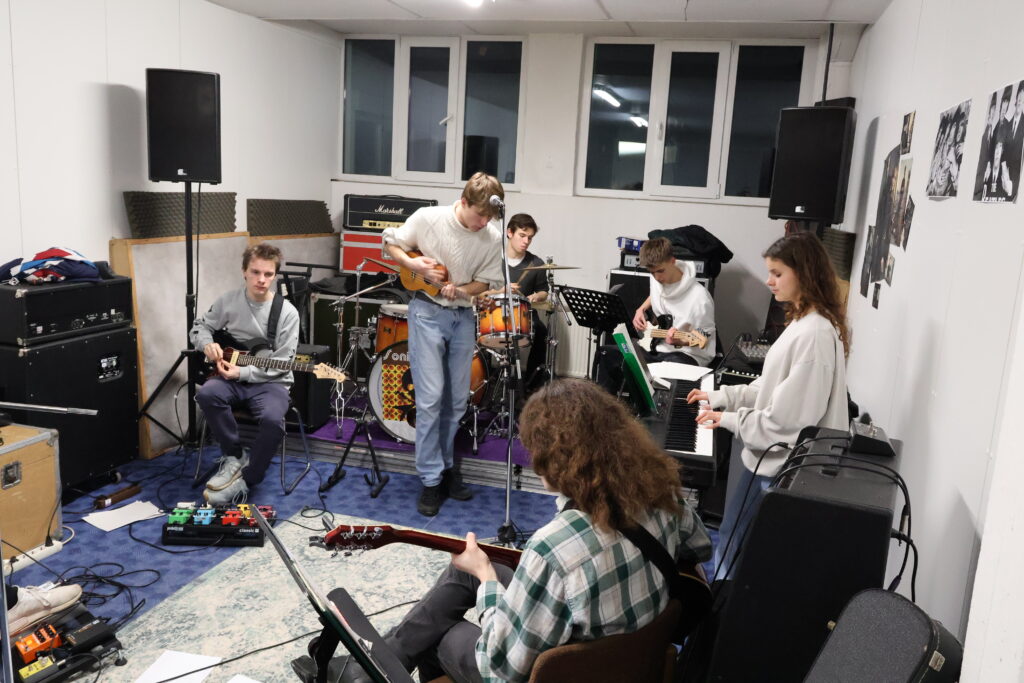 Sie sind alle etwas unkonzentriert. Fahrig irgendwie. Spielen durcheinander, jeder für sich – nur nicht zusammen als Band. Immer wieder ist eine Gitarre zu laut, das Schlagzeug zu leise oder die Melodie stimmt nicht ganz. Jonathan liest den Text vom Handy und Ruben hat die Akkorde noch nicht direkt parat. Die Stimmung im Proberaum der Musikschule JamClub, Nähe der Blauen Brücke, könnte besser sein. Aber so ist das ja, als Künstler*in: Die Generalprobe muss schlecht laufen, dann wird der Gig gut.
