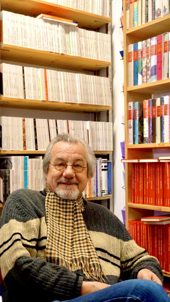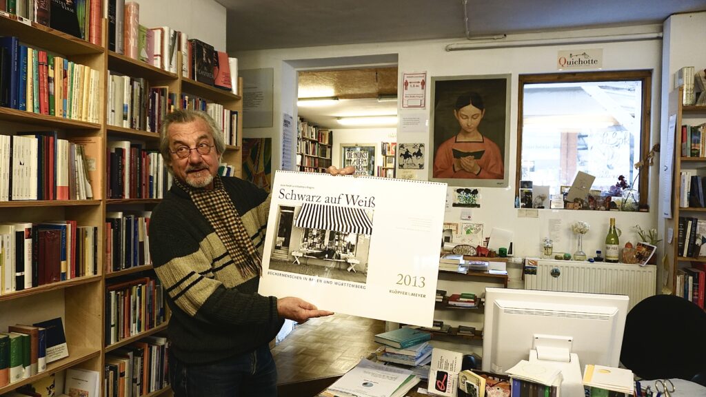 „Nein, das hat sich wirklich organisch ergeben“, er schmunzelt und nippt an seinem Kaffee. Begonnen hat seine Geschichte mit einem türkischen Laden, der damals in seinem Haus war. Er und der Inhaber verstanden sich gut und die beiden tranken im Sommer immer zusammen Lindenblütentee, da dem Lindenblüten nachgesagt wurde, dass sie das Leben verlängern würden. Doch trotz der Lindenblüten starb der Ladenbesitzer und so ergab es sich, dass Herr Zwierzynski zu seinem ersten Laden in der Neckarhalle kam. „Dort wollte ich ursprünglich ein Büro machen für Lektorat und Korrekturen. Der Buchhandel hat sich dadurch ergeben, dass ich jemanden vom „Stroemfeld roter Stern“ kannte, einem Verlag, den es heute nicht mehr gibt, aber ich kannte den Vertriebsleiter sehr gut. Eines Tages rief er mich an und erzählte mir, dass er von den großen Buchhandlungen gesagt bekommen habe, dass es nicht mehr nötig sei, dass er käme. Aus lauter Wut habe ich dann gesagt: Rudi, ich kann auch nebenher Bücher verkaufen! Und so bin ich auf die Idee gekommen, nebenher Buchhandel zu machen“. Als ich ihn frage, wie das Verkaufen von Büchern nebenher ausgesehen hat, meint Herr Zwierzynski schlicht; „Ich habe ein Regal in mein Büro gestellt“. Das war der Anfang des heutigen Quichotte.