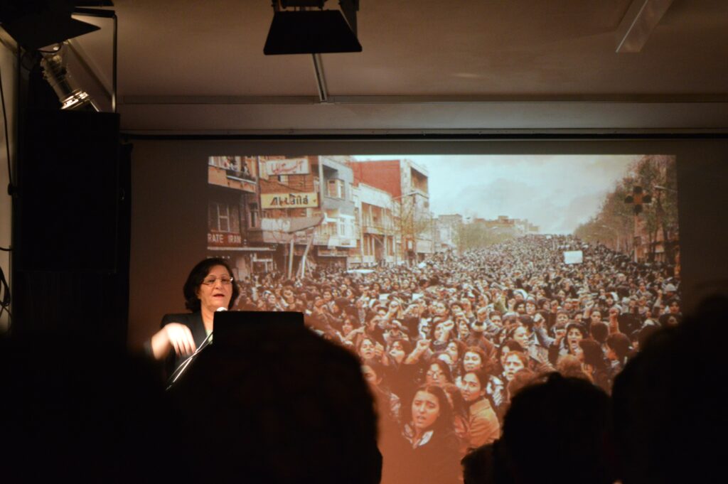 Mina Ahadi zeigt Bilder der Revolution von 1979.