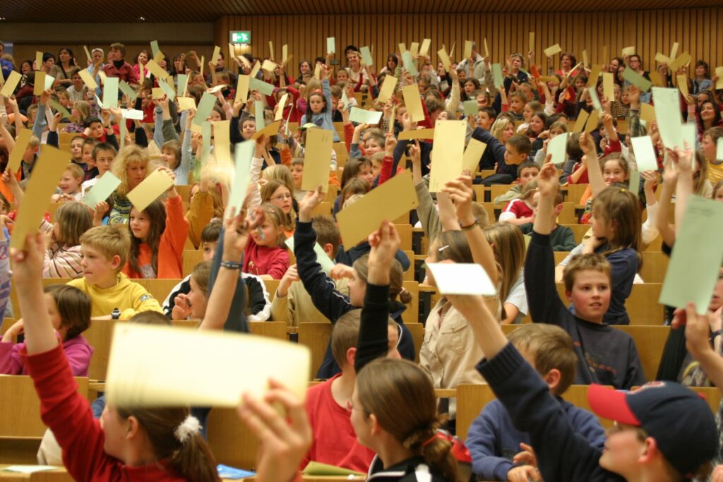 Im Gegensatz zu den meisten Menschen müssen Vögel nicht Gesang studieren, um diesen professionell zu beherrschen. Doch wie lernen Vögel Gesang und warum singen sie überhaupt? Damit hat sich die dieswöchige Vorlesung der Kinder-Uni beschäftigt. Wie üblich gut besucht, folgten am Dienstag im Kupferbau ca. 50 Kinder mal gebannt, mal unaufmerksam dem wissenschaftlichen Vortrag. Das bereits von vielen anderen Unis weltweit übernommene Konzept begeistert Jung und Alt durch seine Themenvielfalt und kindgerechte Erklärweise.