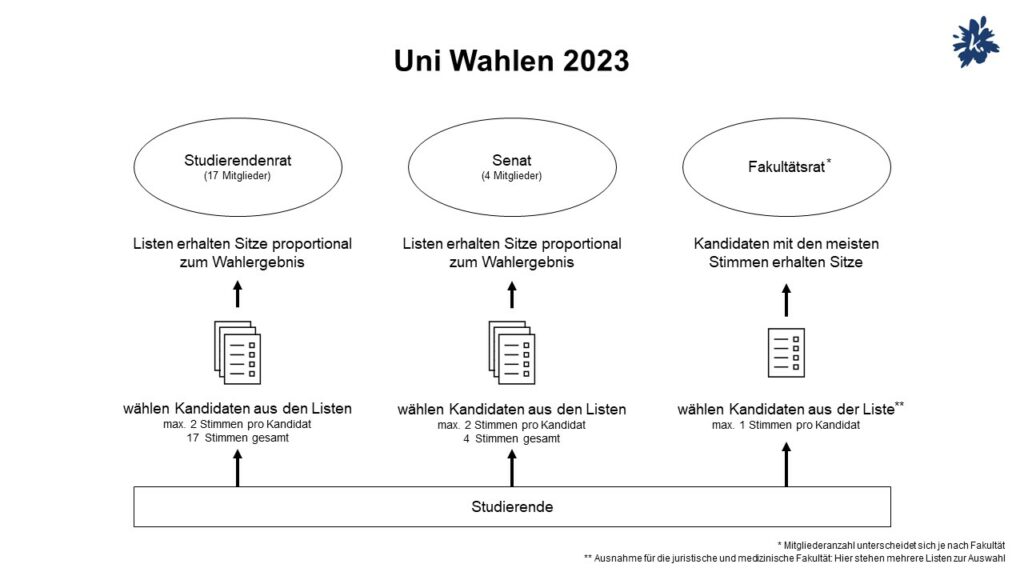 Bei der Wahl zum StuRa und zum Senat haben die Studierenden die Möglichkeit, die Kandidierenden aus mehreren Listen zu wählen. Vor jedem Namen befinden sich zwei Kästchen. Somit kann man durch Ankreuzen beider Kästchen dem bzw. der entsprechenden Kandidat*in maximal zwei Stimmen geben. Insgesamt kann man für den StuRa 17 Stimmen und für die Wahl zum Senat vier Stimmen auf die Kandidat*innen verteilen. Beachte: Wenn man sich entschieden und ein Kreuz gesetzt hat, kann man dies durch Wegstreichen nicht mehr zurücknehmen. Der Grund dafür ist die maschinelle Auszählung der Stimmen. Insgesamt wird der neue StuRa aus 17 Mitgliedern bestehen, für den Senat werden vier Mandate neu vergeben. Als Erstes werden nur die Listen ausgezählt und wie viele Stimmen diese insgesamt bekommen haben. Nach diesem Verhältnis erhält die Liste dann die Plätze. Jede Liste besetzt dann diese Plätze mit ihren Kandidat*innen, die innerhalb der Liste die meisten Stimmen bekommen haben: Die Kandidat*innen mit den meisten Stimmen von jeder Liste nehmen dann die Sitzplätze ein, die ihrer Liste zugesprochen wurden.
