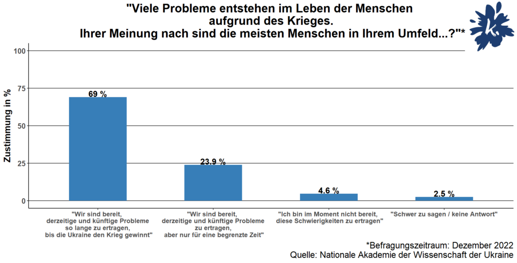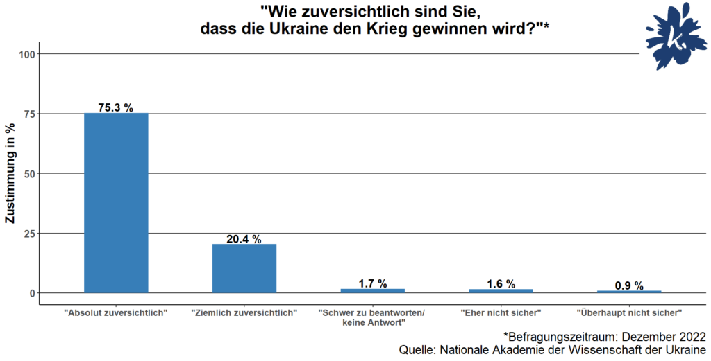 93 Prozent der befragten Ukrainer*innen gaben zuletzt an, dass sie bereit seien, das Leid, das der Krieg für sie und ihre Angehörigen bedeutet, weiter zu ertragen und die Fortsetzung des Krieges somit zu akzeptieren. Zwar geben 23,9 Prozent von ihnen an, dass sie nur vorerst dazu bereit seien, aber eine deutliche Mehrheit von 69 ist dennoch entschlossen, so lange durchzuhalten, bis die Ukraine den Krieg gewonnen hat.