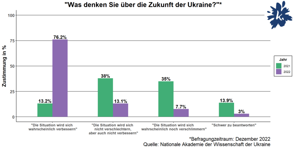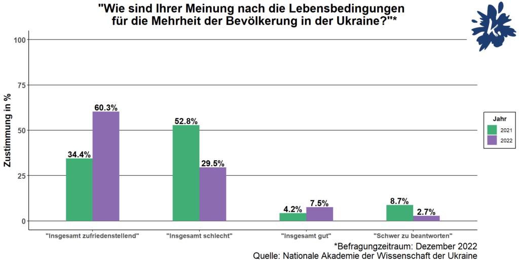 Und dennoch zeigt die ukrainische Bevölkerung in Umfragen eine erstaunliche Zuversicht. Nicht nur geht eine große Mehrheit davon aus, dass sich die Lage der Ukraine in Zukunft wahrscheinlich bessern wird, deutlich mehr Ukrainer*innen als vor dem Krieg sind sogar davon überzeugt, dass ihre Lebensbedingungen aktuell zufriedenstellend seien (siehe Grafik).