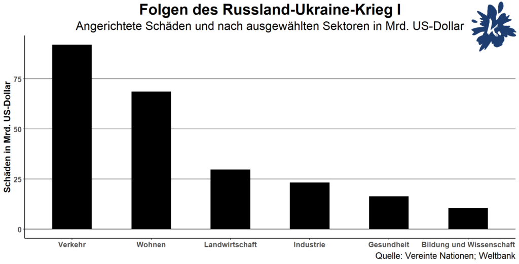 Der Krieg geht mit enormen Schäden für die ukrainische Wirtschaft einher. Zahlreiche Gebäude und wichtige Infrastruktur sind komplett oder in Teilen zerstört. Die Verminung von Häfen erschwert oder verhindert den Export ukrainischer Waren wie Getreide, von welchem die Ukraine zu den weltweit größten Produzenten gehört. Das führte nicht nur dazu, dass weltweit die Lebensmittelpreise stiegen, sondern auch dazu, dass dem ukrainischen Staat und ukrainischen Unternehmen wichtige Einnahmequellen fehlen. Die Vereinten Nationen und die Weltbank schätzen, dass der Ukraine für den Zeitraum Februar 2022 bis Februar 2023 wirtschaftliche Schäden in Höhe von 135 Milliarden US-Dollar entstanden sind.