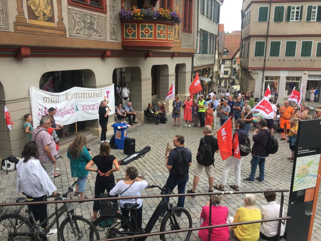 Donnerstag, 16:30 Uhr: Langsam füllt sich der Platz vor dem Rathaus. Es werden Ver.di-Flaggen verteilt, manche Leute tragen orange Müllabfuhrhosen. In einer Stunde stimmt der Gemeinderat über die Privatisierung der Tübinger Müllabfuhr ab. Die Stadt sieht sich gezwungen, einen entsprechenden Vertrag mit dem Landkreis zu kündigen und somit die Entsorgung von Bio- und Restmüll privaten Unternehmen zu überlassen. Gelbe Säcke und Papier werden bereits von der Firma Alba entsorgt. Die Veranstalter der Kundgebung, zu der die Gewerkschaft Ver.di und die Tübinger Linke aufgerufen haben, möchten mindestens eine Vertagung der Entscheidung erreichen. Auch Petra Seitz ist zu Kundgebung gekommen, sie hat ein Schild dabei: „Privatisierung ist Müll“. Auf meine Frage, warum sie heute demonstriere, antwortet sie, dass es schon in zu vielen Bereichen Privatisierung gegeben habe. Das sei der falsche Weg; Müllentsorgung sei Aufgabe der Kommune. Sie macht sich vor allem Sorgen darum, dass die Beschäftigten in einer privaten Müllentsorgungsfirma deutlich schlechtere Arbeitsbedingungen hätten und auch die Qualität der Müllentsorgung darunter leiden könnte.