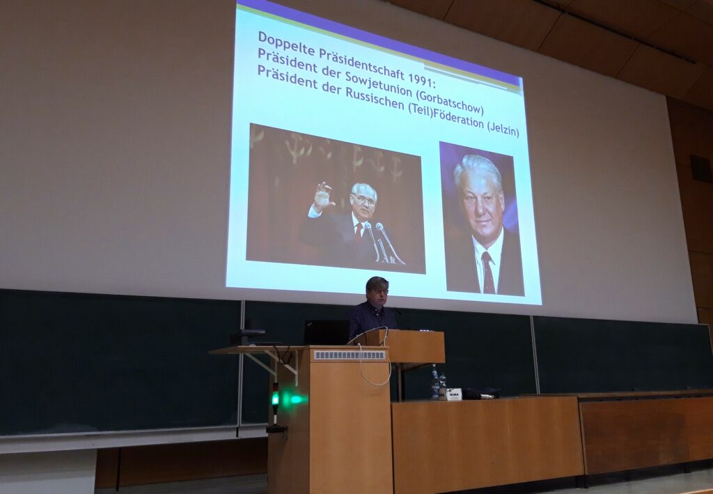 Der am Abend des 28. Juni im Rahmen der Studium-Generale-Vorlesungsreihe „Demokratien und ihre aktuellen Herausforderungen“ gehaltene Vortrag beginnt mit Michail Gorbatschow, dem im August letzten Jahres verstorbenen Staatspräsidenten der Sowjetunion. Gut 37 Jahre vorher, im März 1985, wurde der Politiker Generalsekretär der Kommunistischen Partei. Bekannt ist Gorbatschow heute insbesondere dafür, eine dringend notwendige Modernisierung vorgenommen zu haben, die unter dem Namen „Glasnost und Perestroika“ (Offenheit und Umbau) firmierte. Gorbatschow, so Gestwa, verfolgte das Ziel, den Sozialismus in der Sowjetunion „fit für das 21. Jahrhundert“ zu machen. Während der Friedensnobelpreisträger nach seinem Tod im Deutschen Bundestag als Wegbereiter der Wiedervereinigung gewürdigt wurde, gilt er in Russland als „Totengräber des Sowjetimperiums“. Putin habe dem Verstorbenen, wie der Tübinger Historiker meint, „demonstrative Abschätzigkeit“ entgegengebracht und trete dessen Erbe nun gezielt mit Füßen.