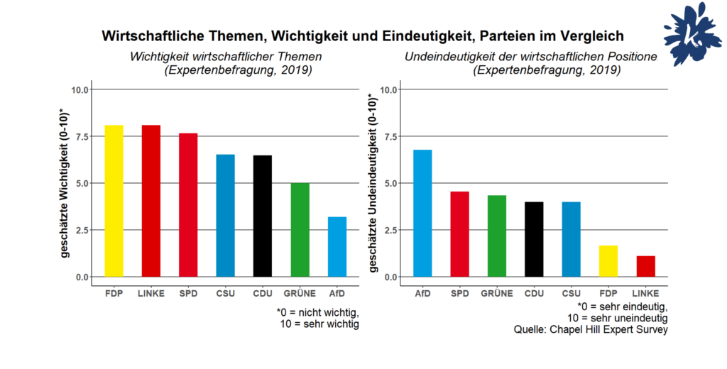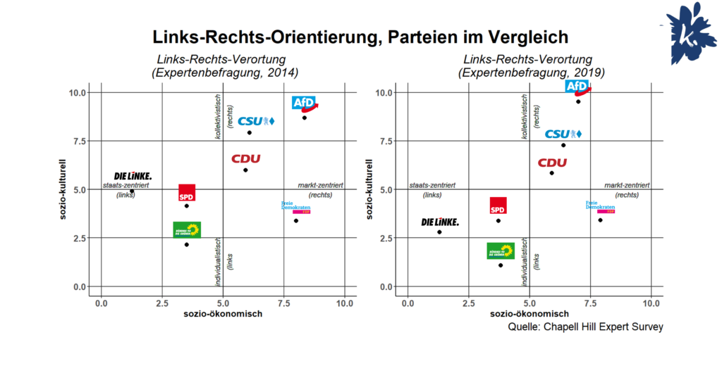 Die zunehmende Verdrängung wirtschaftsliberaler AfD-Politiker*innen aus der Partei hat demnach auch dazu beigetragen, dass sich die AfD zunehmend Positionen des national-konservativen und völkisch-nationalen Flügels angeeignet hat. Die AfD hat sich dadurch in den letzten Jahren bei sozioökonomischen Themen leicht nach links bewegt, auch wenn sie zuletzt in Expertenbefragungen in 2019 in dieser Hinsicht nach wie vor rechts der Union und nur ganz leicht links der FDP eingeschätzt wurde (siehe Grafik)