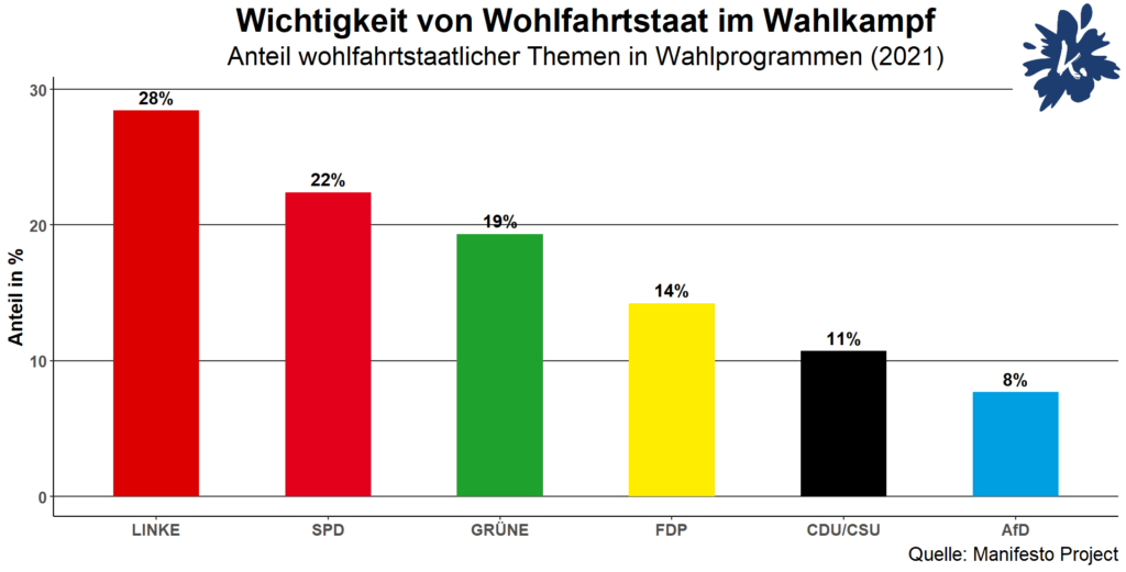 Gleichzeitig setzt sich keine der Parteien im Bundestag in ihrem letzten Wahlprogramm derart wenig mit Themen rund um die Ausgestaltung des Wohlfahrtsstaats auseinander, wie die AfD (siehe Grafik). Es scheint so, als seien der AfD trotz all der Inszenierung als „Partei der kleinen Leute“ (Alexander Gauland) andere, vor allem kulturpolitische, Themen letztlich deutlich wichtiger als die Frage, wie man Politik für genau diese kleinen Leute macht.