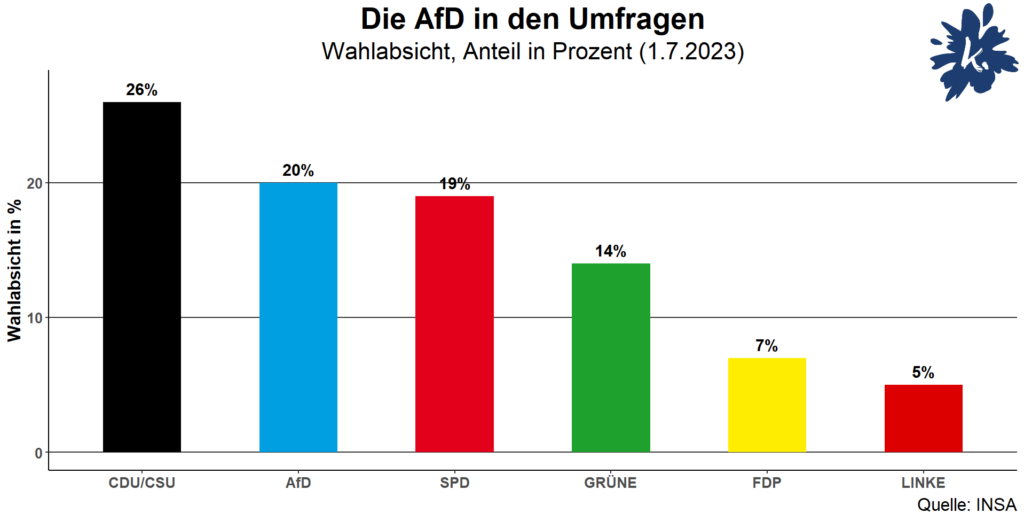 Wären diesen Sonntag Bundestagswahlen, würde die AfD zur zweitstärksten Fraktion im Bundestag gewählt werden. Zu diesem Ergebnis kommen gleich eine Reihe repräsentativer Umfragen (siehe Grafik). Für die demokratischen Prinzipien und Prozesse, auf denen die Bundesrepublik Deutschland aufgebaut ist, könnte das zu einem Problem werden. Denn die AfD gilt in der Politikwissenschaft als rechtspopulistische und größtenteils rechtsextreme Partei.