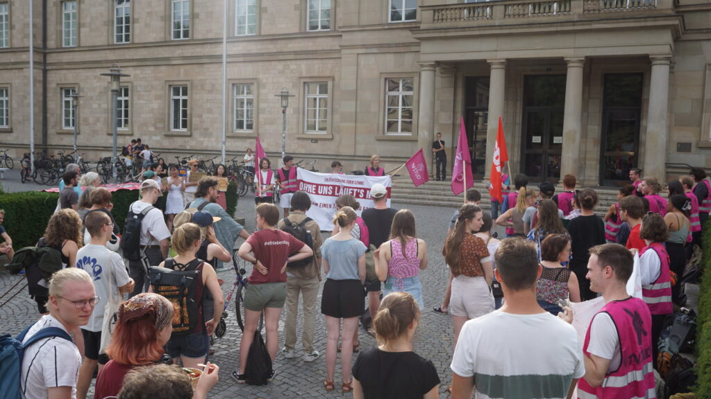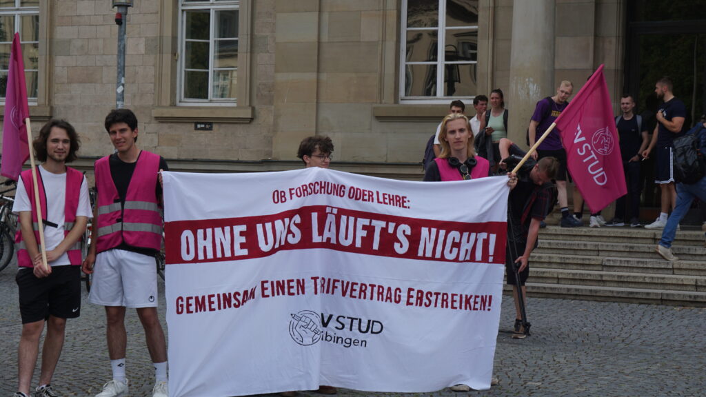 Wenn der Finanzminister des Landes Baden-Württemberg an die Uni kommt, ist das natürlich ein Anlass, um prekäre finanzielle Situationen zu kritisieren und Forderungen zu stellen. Bereits vor der offiziellen Veranstaltung versammeln sich Studierende vor der Neuen Aula, um auf ein Thema besonders aufmerksam zu machen: Sie fordern einen Tarifvertrag für Studierende, die an der Universität als Hilfskräfte oder Tutor*innen angestellt sind. In den Redebeiträgen der Kundgebung wird klar, dass sowohl Lohn als auch Arbeitsbedingungen zu wünschen übrig lassen. Hilfskräfte ohne Abschluss bekommen Mindestlohn, mit Bachelorabschluss bekommt man ganze 35 Cent mehr. Viele Studierende seien auf diesen Job und das Geld angewiesen, unabhängig davon, dass solch ein Job oft als Chance für die Karriere der Studierenden angesehen werde. Es wird auf die schwierige ökonomische Lage vieler Studierender hingewiesen, gleichzeitig seien die Reallöhne im Vergleich zu früher durch die Inflation deutlich gesunken.