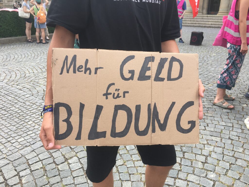 Im Moment finden in Baden-Württemberg zwischen Ver.di und dem Land Verhandlungen über einen Tarifvertrag für studentische Beschäftigte statt, Finanzminister Bayaz hat sich hierzu noch nicht positioniert. Die Teilnehmenden der Kundgebung werden dazu aufgefordert, bei der Veranstaltung mit Fragen Druck zu machen. Margrit Paal von Ver.di betont noch einmal, dass man bei den Tarifverhandlungen alles versuchen werde. Wenn das Ergebnis am Ende nicht zufriedenstellend sei, dürfe man nicht den Gewerkschaften die Schuld geben. Ein weiteres Thema, bei dem Bayaz durchaus eine wichtige Rolle spielt, wird ebenfalls bei der Kundgebung angesprochen: Internationale Studierende, die nicht aus der EU kommen, müssen in Baden-Württemberg pro Semester 1.500 Euro Studiengebühren bezahlen. Diese Summen seien nur schwer zu stemmen, nicht alle Internationals haben reiche Eltern. Es sei nicht die Aufgabe von internationalen Studierenden, Finanzlücken zu schließen.