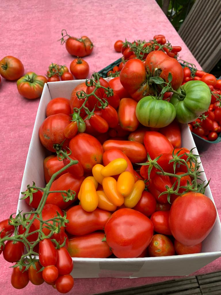 Diese Tomaten wachsen wie verrückt! Ich habe ein wenig die Übersicht verloren und habe einen Tomatendschungel erschaffen. Die Ernte gestaltet sich ein wenig mühsam. Dennoch weiterhin kiloweise Tomaten geerntet. Habe sie weitestgehend verschenkt als „Gruß aus meinem Garten“. Die Nachbar*innen scheinen mir aus dem Weg zu gehen. Komisch.