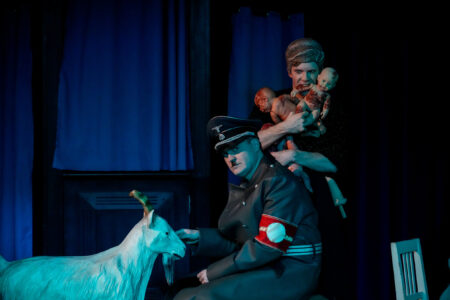 Zwischen Gegenwart und Vergangenheit bewegt sich von Praunheims Stück „Hitlers Ziege und die Hämorrhoiden des Königs“. AfDler, die Hitler wieder auferstehen lassen und dabei singen „AfD, AfD, Arschlöcher für Deutschland“ sind nur die Spitze des Eisbergs und lassen nur erahnen, welche abgedrehten Machenschaften noch in den Räumen des LTTs folgen …